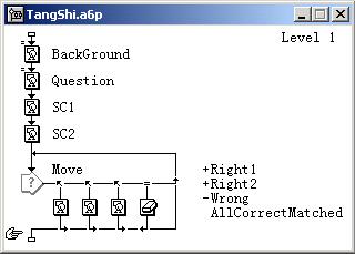 當學生全部拖放正確后,程序必須有所判斷,并給出結果,這里我們設計當詩句全部拖放正確后,直接把顯示問題的"question"顯示圖標給擦除,借此告訴學生答案回答正確,問題完畢。存盤最后程序流程如圖22所示。"f12"一鍵打包后"巧對唐詩"也宣告制作完成。