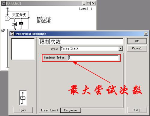 嘗試限制響應是一種限制用戶進行可交互有效次數的響應類型。當用戶進行的操作達到程序事先預定的可交互最大有效次數后,即馬上響應嘗試限制交互分支,如圖10所示的交互流程,假如用戶執行第一個交互分支"執行分支"的次數達到第二個嘗試限制分支"限制次數"所設定的最大嘗試交互次數3次時,則響應執行"限制次數"分支內容。