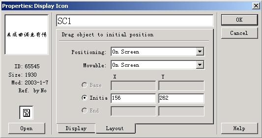 新建一"tangshi.a6p"文件后,設計并導入如圖20所示的程序背景及相關圖片資源。其中顯示圖標"background"放置程序背景,顯示圖標"question"放置的是問題提示,為了防止意外的拖動,把顯示圖標"background"和"question"固化,即在它們的附帶計算代碼里輸入:movable:=false即可。而顯示圖標"sc1"和"sc2"放置的是供學生選擇的詩句,為了可讓學生在程序窗口內任意拖動它們,必須設置它們的"positioning"和"movable"屬性均為"on screen",設置如圖21所示。