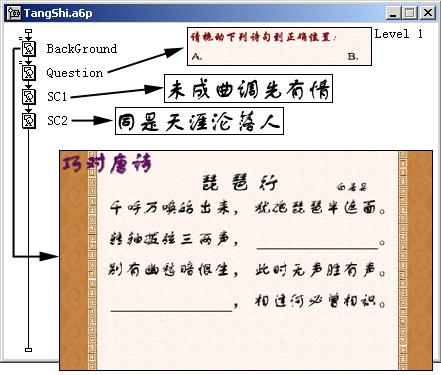 上小學語文時,老師經常會點人起來背古詩。多媒體輔助課件盛行的今天,讓我們制作一個電腦上運行的"巧對唐詩"課件,如圖19所示。程序執行預覽圖中古詩有兩斷句,要求學生選擇正確答案,并將答案拖至詩中正確位置。