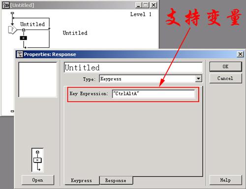 和文本輸入響應類似,authorware 6.5的按鍵響應屬性里的【key expression】按鍵表達式也是支持變量作為響應按鍵或者組合鍵。例如在【key expression】文本框里輸入按鍵表達式:"ctrlalta"該表達式表示當按下組合鍵"ctrl+alt+a"的時候程序響應該交互分支。