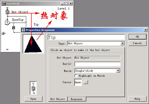 熱對象響應是通過對程序設定的某個對象的動作而產生響應類型。熱對象響應和熱區響應類似,它們的響應屬性設置方式也幾乎相同,唯一不同的就是熱區產生響應的對象是一個規則矩形區域范圍,而熱對象則是一些實實在在的物體對象,這些對象可以是任意形狀,例如圓形、不規則三角形狀等等,如圖4所示,這也是熱對象響應比熱區響應更加靈活方便的體現。但是需要注意的一點是在熱區響應程序中,所有的畫面可以放置在一幅圖,即一個顯示圖標中,而在熱對象響應的制作過程中卻不可以,熱對象中的每一個對象必須保證單獨放置在一個顯示圖標中。