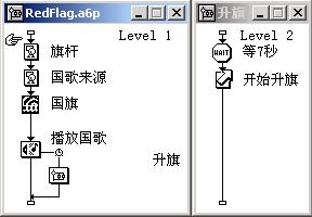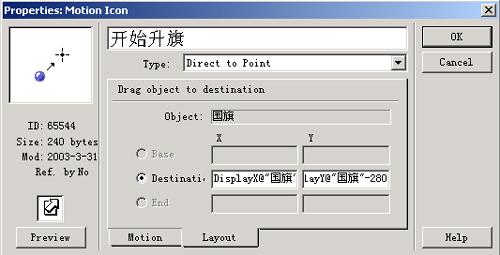 群組圖標(biāo)"升旗"的二級(jí)流程如圖7右圖所示,升旗動(dòng)作即是通過(guò)移動(dòng)圖標(biāo)"開(kāi)始升旗"移動(dòng)animated gif圖標(biāo)"國(guó)旗"來(lái)完成的,其屬性設(shè)置如圖9和圖10所示。“motion”選項(xiàng)卡中的“timing”域選擇為"time(sec)",速率設(shè)置為37;“concurrency”域選擇為"concurrent"即同步執(zhí)行方式。“l(fā)ayout”選項(xiàng)卡中設(shè)置的是具體的移動(dòng)目標(biāo)位置,這里我們選擇"direct to point"移動(dòng)方式,目標(biāo)位置(destination)當(dāng)然就是旗桿的頂部,因此我們?cè)O(shè)置目的地的x坐標(biāo)為"displayx@"國(guó)旗"",y坐標(biāo)為"displayy@"國(guó)旗"-280"即可。