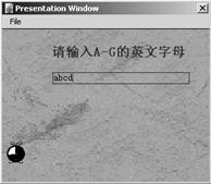 如圖10-19所示,播放課件時,時鐘將開始計時,用戶可直接在文本框內輸入a~g的英文字母,輸入完畢之后,單擊回車鍵表示結束。如果輸入正確,并且沒有超時,那么將顯示abcdefg結果圖標的內容。如果超時,或未在確定的時間6秒內輸入完畢,那么將顯示sorry圖標的內容。