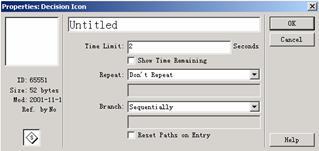 time limit文本框用于確定決策結(jié)果花費(fèi)的時間,用戶可在此輸入數(shù)值、變量或表達(dá)式。當(dāng)?shù)竭_(dá)規(guī)定的時間內(nèi),authorware 6.0將中斷當(dāng)前的進(jìn)程,退出決策結(jié)構(gòu),開始執(zhí)行決策圖標(biāo)下方的圖標(biāo)。