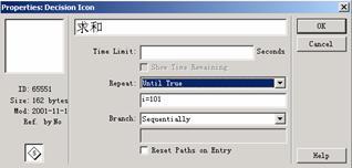 在決策圖標的屬性對話框內,將repeat設置為untiltrue及i=101(如圖11-15所示)之后,同樣能夠從1一直加到100,當i達到101時,由于循環條件變為真,因此自動退出決策結構。