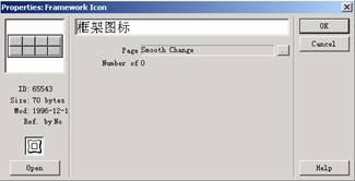 通過properties:framework icon對話框,可以進一步地認識到框架圖標只能設置結點頁之間的過渡效果,但結點頁之間的鏈接關系則必須由瀏覽圖標來實現。