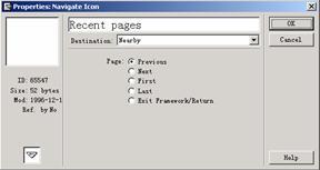 打開destination下拉列表框,選擇nearby時,對應的瀏覽圖標屬性對話框如圖12-7所示,page選項組內出現5個選項。選中previous單選按鈕時,將跳轉到當前結點頁的前一頁。選中next單選按鈕時,將跳轉到當前結點頁的后一頁。選中first單選按鈕時,將跳轉到框架圖標管理的第一個結點頁。選中last單選按鈕時,將跳轉到框架圖標管理的最后一個結點頁。選中exit framework/return單選按鈕時,將退出框架或返回。