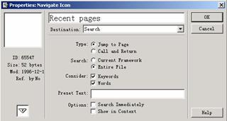 在destination下拉列表框內選擇search時,將打開如圖12-10所示的瀏覽圖標屬性對話框,它允許用戶對關鍵字進行搜索,并跳轉到該單詞所在的結點頁。它適用于根據查找結果確定結點頁的場合。