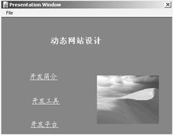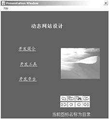 由于將文本應(yīng)用了navigate to特性,因此它們就成為超文本,單擊超文本時,如果鏈接目標(biāo)已經(jīng)存在,那么將在演示窗口內(nèi)顯示鏈接目標(biāo)的內(nèi)容,否則將打開properties:navigation對話框,用于確定打開的鏈接目標(biāo)及其顯示方式。