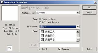 對于普通的文本應(yīng)用navigate to特性之后,在演示窗口內(nèi)打開時,將自動顯示navigation對話框,用于確定鏈接目標(biāo)的位置,凡是框架圖標(biāo)管理的結(jié)點頁都可以作為鏈接的對象。為了從鏈接目標(biāo)返回,還可以分別在鏈接目標(biāo)內(nèi)添加一個指向目錄的返回鏈接。