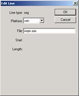 執(zhí)行seg命令時,將打開如圖14-9所示的edit line對話框(4),它用于設(shè)置數(shù)據(jù)塊的信息,platform下拉列表框決定課件文件運行的操作系統(tǒng)平臺,用戶可在all (windows和macintosh平臺)、win (所有windows平臺,包括16位和32位)、win16 (16位的windows平臺)和win32 (32位的windows平臺)之間作出選擇。file文本框用于設(shè)置數(shù)據(jù)塊文件在服務(wù)器上的文件名。start顯示當(dāng)前數(shù)據(jù)塊的第一個字節(jié)在課件中的位置,length文本框顯示當(dāng)前數(shù)據(jù)塊的長度,它們都是以“字節(jié)”為單位的。