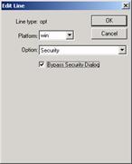 執(zhí)行opt命令時,將打開如圖14-12所示的edit line對話框之(7)。打開options下拉列表框之后,可以看到它包括4個選項。選擇security時,將在對話框的下方顯示bypass security dialog復(fù)選框,啟用該復(fù)選框時,將使authorware web player在開始下載某個文件之前不會打開security對話框。如果文件試圖對一些安全級別較高的信息進(jìn)行讀取時,authorware web player仍然彈出警告信息,并以非信任的模式繼續(xù)運行課件。