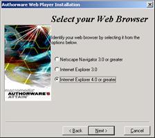 針對不同的瀏覽器,authorware web player install對話框提供了三種選項:netscape navigator 3.0 or greater、internet explorer 3.0與internet explorer 4.0 or greater。由于有條件上internet的互聯網讀者不妨到macromedia的下面這個站點上去測試一下:http://www. macromedia.com/learning/examples/online_examples/。體會一下從網上瀏覽authorware 6.0課件的新感覺。沒有條件上internet互聯網的用戶也不要緊,可以按照下面所述的方法進行測試。