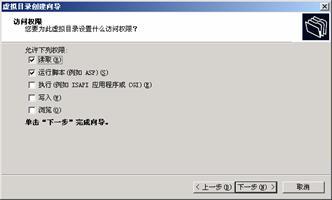 (6) 啟用或取消“允許下列權(quán)限”欄的復(fù)選框,設(shè)置虛擬路徑的訪問權(quán)限之后,單擊“下一步”按鈕,打開如圖14-27所示的“虛擬目錄創(chuàng)建向?qū)А睂υ捒蛑?5)。