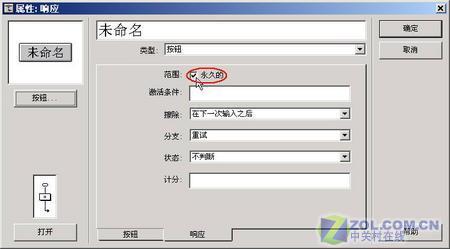 (2) 放置一計算圖標到交互圖標下,命名為“播放背景音樂”,然后設置它的屬性為永久交互,并選擇按鈕為前面有一個小方格類型的按鈕(這是一關鍵步驟),同時必須選中“自動檢測”選項(如圖3);