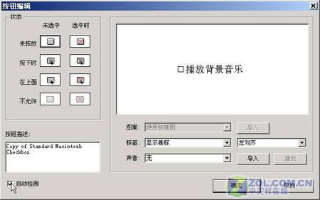 某些情況下我們需要制作一個選項式按鈕,如我們可以在展示窗口上放置一個按鈕,它的標題為播放背景音樂,如果用戶按下它前面的小勾,選中此選項,則播放背景音樂,如果再次按下它前面的小勾,則取消選中此選項,不再播放背景音樂等。下面我們就介紹其制作方法: