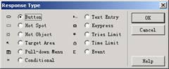 在response type對話框內,每種響應類型單選按鈕的右側都有一個標識圖案,這就是響應類型的標識符。在課件的流程線上,只能看到這種標識符,而不會出現類似event這樣的文字說明。每當用戶在response type對話框內選擇不同的單選按鈕時,即使沒有單擊ok按鈕進行確認,流程線上的交互響應的標識符也會同步發生變化。