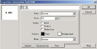 在交互圖標的屬性設置對話框內,單擊text field按鈕時,將打開一個交互圖標文本框屬性對話框(如圖6-6所示)。如果演示窗口沒有打開,那么同時也會被打開。