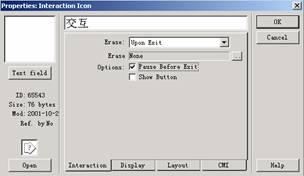 在屬性對話框的左側是交互圖標的通用選項,通過預覽窗口可以觀看交互圖標的顯示效果。id欄內顯示交互圖標對應的id號,它在整個課件中都是惟一的。size欄顯示圖標的大小。mod欄顯示該圖標的最后一次修改的時間。ref by name欄顯示該圖標是否被一些變量所引用。如果被引用,則顯示yes,否則顯示no。單擊open按鈕之后,將在演示窗口內打開交互圖標。