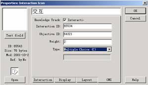 weight文本框用于確定交互的相對重要性。如果使用cmi add interaction函數,authorware 6.0會把這里輸入的id值作為該函數的weight參數。
