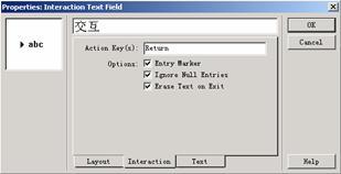 選擇interaction標簽時,將打開如圖6-7所示的interaction選項卡。action key文本框用于設置文本輸入的確定鍵,即用戶在輸入完文本后,必須按這里設置的確定鍵告訴authorware 6.0輸入結束,然后authorware 6.0就可以記錄用戶的輸入值以便進行比較。默認情況下確定鍵是enter鍵,如果需要確定多個確定鍵,可以使用“|”進行分隔。