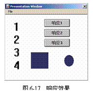 完成按鈕響應的屬性設置之后,就可以著手對結果圖標進行編輯。結果圖標就是在交互圖標內與一個流程分支所對應的圖標,它們可能是顯示圖標、擦除圖標、計算圖標或影像圖標等等。例如,分別對三個結果圖標的內容進行設置,它們對應的響應名稱分別是“響應1”、“響應2”和“響應3”,在演示窗口打開包含上述交互按鈕的課件之后,單擊這些按鈕時,就會得到如圖6-17所示的響應效果。