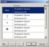 選擇相應的光標文件之后,單擊“打開”按鈕就可以為更改所選按鈕響應的光標顯示。除此之外,可單擊edit按鈕,此時也將打開一個與圖6-14非常類似的對話框。在cursors對話框內單擊delete按鈕時,將刪除所選的光標文件。