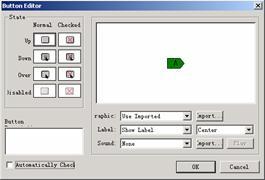 在button editor對話框內,按鈕up是按鈕處于彈起狀態,等待用戶進行鼠標操作。down是用戶在按鈕上單擊之后的狀態。over是將鼠標移動到按鈕上,但沒有單擊的狀態。disable是按鈕處于禁用的狀態。