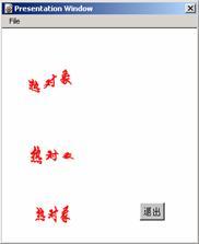 在本例中,將“熱對象”三個字經過photoshop處理,依次把它們設置成“旗幟”、“擠壓”及“魚形”之后,將它們存儲為jpeg格式的圖形文件,然后導入到authorware 6.0的顯示圖標內。為了響應用戶的鼠標操作,我們在結果圖標內使用了聲音文件。