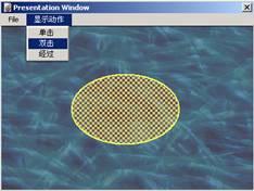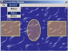 創建一個下拉菜單響應時,authorware 6.0會自動把交互圖標的名字作為下拉菜單的名稱,把每個結果圖標的名字作為菜單項的名字(如圖8-19所示)。例如,當單擊“顯示動作”菜單時,將在下拉的菜單內顯示“雙擊”、“單擊”與“經過”。選擇“經過”菜單項時,演示窗口內將顯示鼠標經過對象的過程。同樣,選擇“單擊”菜單項時,演示窗口內將顯示鼠標單擊對象的過程。選擇“雙擊”菜單項時,演示窗口內將顯示鼠標雙擊對象的過程。