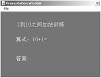 開始播放課件時,將通過random函數(shù)隨機地產(chǎn)生2個10以內(nèi)的整數(shù),并將加法算式顯示在演示窗口內(nèi)(如圖9-11所示),用戶在“答案”的后面輸入結(jié)果,單擊回車鍵之后,將對結(jié)果進行判斷。如果正確,將進行新題目的測試訓(xùn)練,否則將要求用戶繼續(xù)輸入答案,直到答案正確為止。正確或錯誤的提示信息只顯示2秒種,然后由擦除圖標進行擦除。