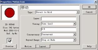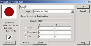 (41) 執行課件文件,當演示窗口內出現正方形方格與圓球時,雙擊移動圖標,打開properties:motion icon對話框。