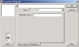 雙擊交互流程線上的嘗試限制響應的標識符之后,將打開properties:response對話框,該對話框包括兩個選項卡:tries limit和response。response選項卡同其他交互類型的response選項卡類似,惟一的區別是scope文本框和active if文本框被禁用,也就是說,不能把嘗試限制響應設置成perpetual類型,也不能使用條件判斷語句來控制嘗試限制響應的狀態。