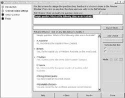 2.完成override global settingse項中的設置后,單擊next按鈕進入設置問題項(如圖3),圖 3是向導的默認設置,我們根據(jù)需要修改題目中的內容、候選答案、判斷結果。首先在preview windows窗口中 選取“sample question:which of the following cities are in australia?”,這時“sample question :which of the following cities are in australia?”會出現(xiàn)在edit window編輯窗口,我們在這里輸入“ 下列小說哪些不是魯迅的作品?”,完成題目的修改。接著在preview windows窗口選取“perth ”(這是正確 的答案選項),在編輯窗口將“perth ”修改為“《家》”,此時就修改完一個候選答案,同樣我們完成其余 的修改工作,這樣問題和答案就已修改完成。單擊next按鈕進入完成項,保存所有設置,退出向導。