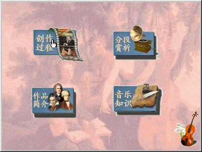 我們接下來(lái)講解“創(chuàng)作過(guò)程”模塊的制作,這部分能實(shí)現(xiàn)的效果是:在作品賞析界面點(diǎn)擊“創(chuàng)作過(guò)程”按鈕,會(huì)出現(xiàn)一個(gè)顯示面板,在上面演示滾動(dòng)的字幕并播放音樂(lè),鼠標(biāo)單擊畫面則回到“作品賞析”界面。