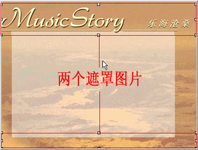 為了讓下面將制作的滾動(dòng)字幕出現(xiàn)在面板的的“顯示區(qū)”(即顏色淡的區(qū)域),就需要制作遮罩,方法是:在“背景-創(chuàng)作經(jīng)過(guò)”圖標(biāo)下面放一個(gè)顯示圖標(biāo),命名為“背景-遮罩”,按shift鍵雙擊圖標(biāo),就能打開包含前一個(gè)背景圖片的展示窗,導(dǎo)入上下兩個(gè)做遮罩的圖片(可從背景圖片上截取),注意與背景圖片對(duì)齊,如圖5所示。