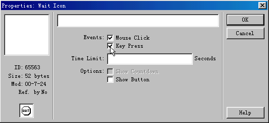 拖一個(gè)等待圖標(biāo)放在流程線上,雙擊等待圖標(biāo),在等待屬性窗口中勾選鼠標(biāo)點(diǎn)擊及按鍵事例,這樣我們按任意鍵或在顯示窗中點(diǎn)擊鼠標(biāo)時(shí),都會(huì)使程序向下運(yùn)行,如圖10所示。