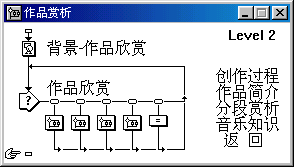 根據(jù)腳本設(shè)計(jì),我們又把“作品欣賞”分為“創(chuàng)作過(guò)程”、“作品簡(jiǎn)介”、“分段賞析”和“音樂(lè)知識(shí)”四個(gè)模塊,這樣首先拖一個(gè)交互圖標(biāo)到流程線上命名為“作品欣賞”,然后再拖動(dòng)四個(gè)組圖標(biāo)到“作品欣賞”的右側(cè),分別命名為“創(chuàng)作經(jīng)過(guò)”、“作品簡(jiǎn)介”、“分段賞析”和“音樂(lè)知識(shí)”。為了能方便的回到主界面,要另加一個(gè)“返回”按鈕,流程線如圖2所示。