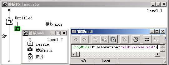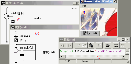 在上面圖3的流程上做一下修改,即在流程線上放一個交互圖標midi控制,在其右邊放一個按鈕:播放midi如下圖中的②;計算圖標播放midi里的