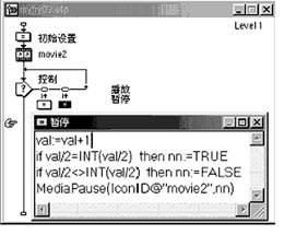 5.設置“暫停”。在“控制”右側放置一“運算”圖標,設置為按扭,命名為“暫停”。“運算”對話框中程序表達式見圖4,mediapause()也是authorware系統多媒體函數,和mediaplay()相對應,mediapause()使動畫播放暫停或繼續。表達式中“iconid@′movie2′”對應播放的動畫文件。變量nn為true時,暫停播放動畫,nn為false時,繼續播放動畫。