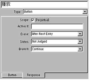 3.設置“播放”。放置一個“交互”圖標,命名為“控制”。在其右側放置一“運算”圖標,設置為按扭,命名為“播放”。在“交互”按扭“properties”對話框中選中“response”標簽,各選項設置如圖2所示。“運算”對話框中輸入程序“rate:=10”即可。