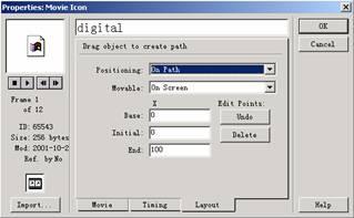 在打開的properties:movie icon對話框內,用戶可以看到3個標簽,即movie標簽、timing標簽和layout標簽。選擇這些標簽之后,都將打開與之對應的選項卡,通過對其中參數的調整,用戶可以輕松地完成當前數字影像圖標的屬性設置。
