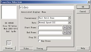 雙擊視頻圖標時,將打開如圖5-9所示的properties:video icon對話框,它是由video選項卡和timing選項卡組成的。對于視頻圖標來說,左側的預覽窗口顯示為空。單擊preview按鈕,再單擊preview按鈕可以按順序播放視頻,播放的開始幀可以是視頻片段的開始處,或者是用戶在start frame文本框中指定的幀數。并且該視頻是按照視頻圖標屬性對話框中指定的選項進行播放的。