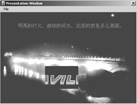 播放課件時,首先顯示背景圖片,由于添加了等待圖標,這樣背景圖片將顯示5秒鐘。在此之后視頻文件開始播放,并且文字從演示窗口的右側向左側運行,當視頻停止播放時,文字的運動也將結束,如圖5-25所示。課件的流程圖如圖5-26所示。