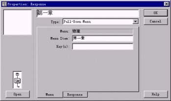 (8)在【properties:response】對話框中的左下方有〖open〗區域,該區域上方是設計按鈕的類型預覽。單擊〖open〗命令按鈕可以打開該按鈕響應分支結構中的設計按鈕,即在圖中預覽的設計按鈕。authorware提供的該功能使用戶減少了在多層的程序流程中來尋找該設計按鈕。用戶只需單擊〖open〗命令按鈕即可以立刻打開該設計按鈕。