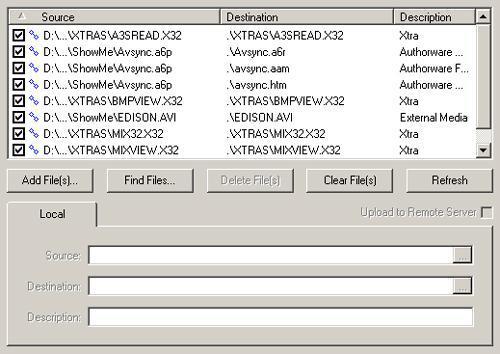 “files”文件選項卡如圖5所示。在文件列表框中列出了該程序打包的所有相關文件,例如相關的驅動文件(*.x32、*.xmo等)、外部媒體文件(*.avi、*.wav等)、擴展函數庫(*.u32、*.dll等)等,當然也包括即將發布輸出的相關打包文件,例如*.exe、*.a6r、*.aam、*.htm等文件,根據發布形式的不同而異。