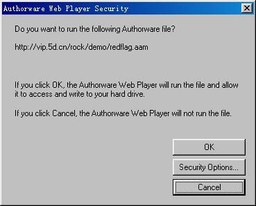 “show security dialog”,即每次是否都顯示如圖3所示的authorware網絡播放器的安全提示對話框;注意只有在信任的模式下網絡播放器才允許直接下載相關文件到用戶的硬盤上,否則會提示出錯。