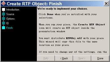 5.點擊next>到下一步,出現finilish對話框,知識對象的設置結束,文字提示說知識對象調用了rtfobj.u32文件,程序文件發行時必須帶上這個文件,如圖6所示。