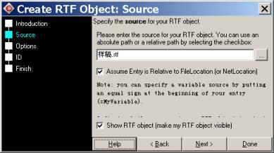 按鈕,出現打開文件對話框,選擇需調用的rtf文檔,若文檔與調用它的程序在相同的文件夾中.,可勾選assume entry is relative to file location(or netlocation)復選框;如勾選show rtf object復選框,rtf文檔內容在展示窗口中可見。如圖2所示。